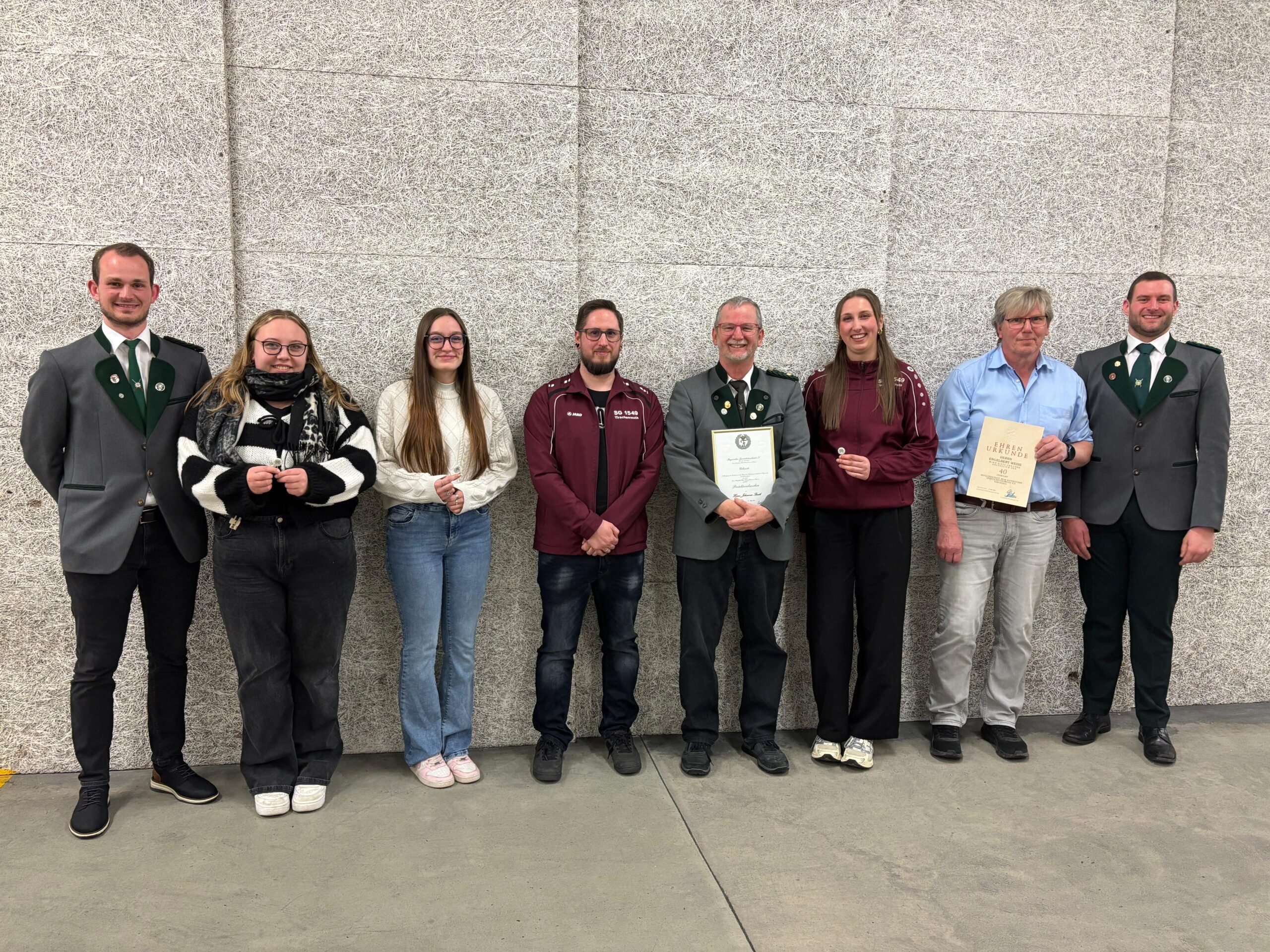 Im Bild (v.l.n.r.): Christina Bartl, Jonas Schedl, Gerhard Härtl, Klara Grüner, Friedrich Jahn, Erster Bürgermeister Franz Stahl, 2. Schützenmeister Nico Wiesend, 1. Schützenmeister Tobias Birkner sowie 1. Sportleiter Peter Härtl (Bild: Lisa Kollarik)